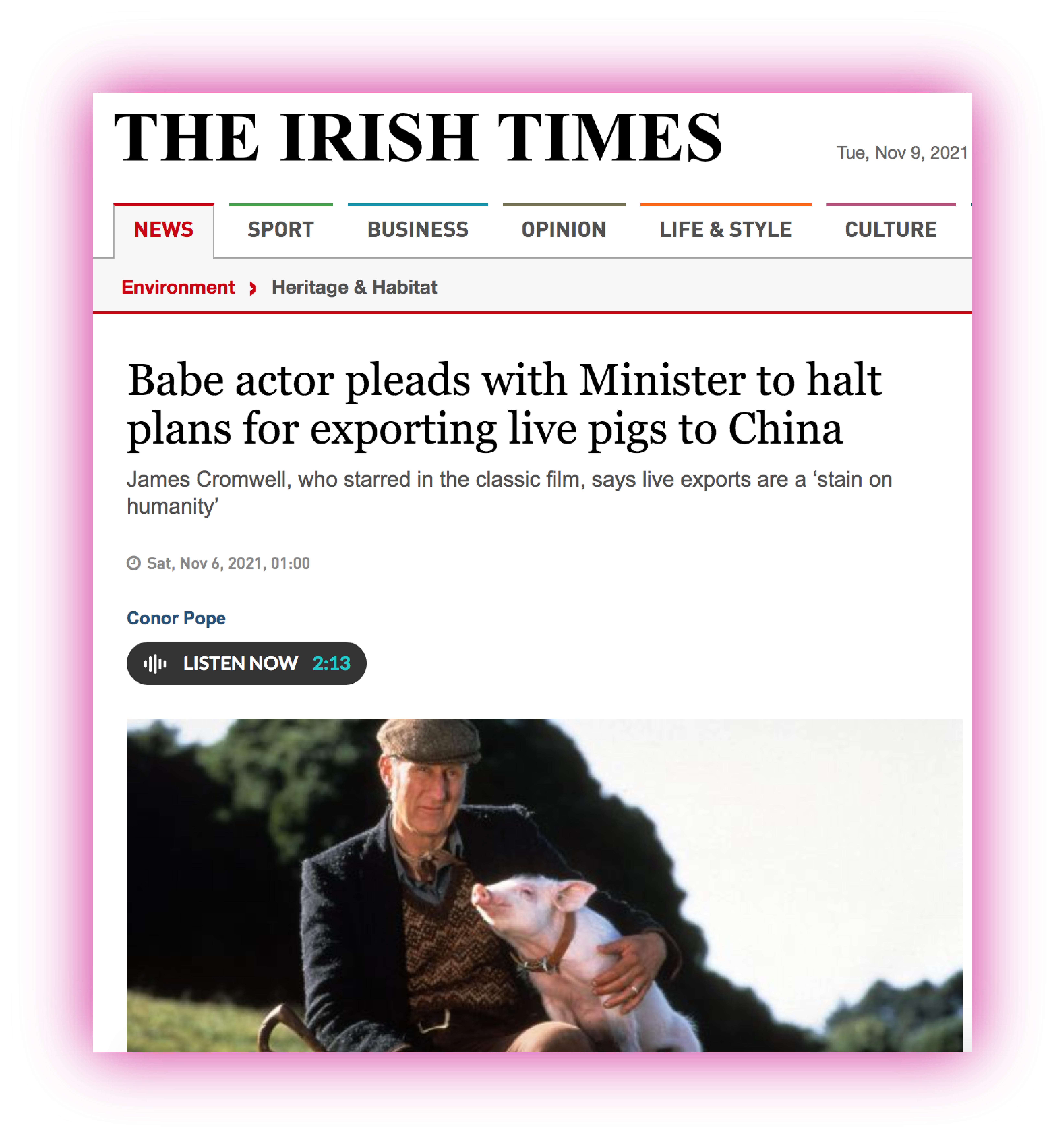 and My Lovely Pig Rescue to demonstrate outside Dáil Éireann, demanding that the government cancel their plans to fly pigs to China (click the image on the right below.) Our protest caught the eye of many journalists and one celebrity in particular. See what James Cromwell, best known for his role as the farmer in ‘Babe’, has to say to the Irish government by clicking the left image below.